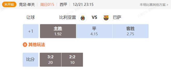1.基本面:本賽季比利亞雷亞爾15輪11勝2平2負,進31球丟13球積35分,排名第3,主場7勝1平。巴塞羅那17輪14勝1平2負,進49球丟20球積43分,排名第1,客場5勝1平2負。